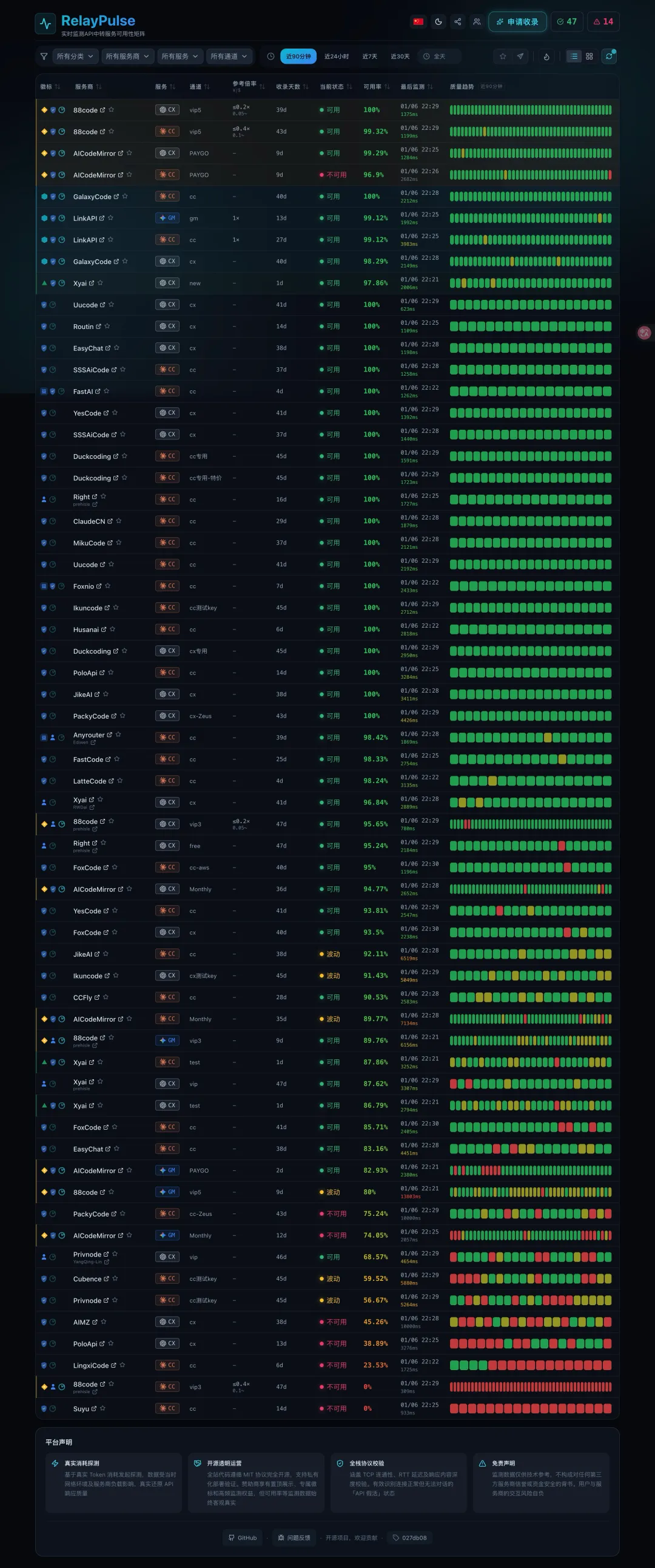 首先,你需要查看中转站可用性矩阵站。这就像是 API 界的"天气预报",谁在裸泳,一目了然。