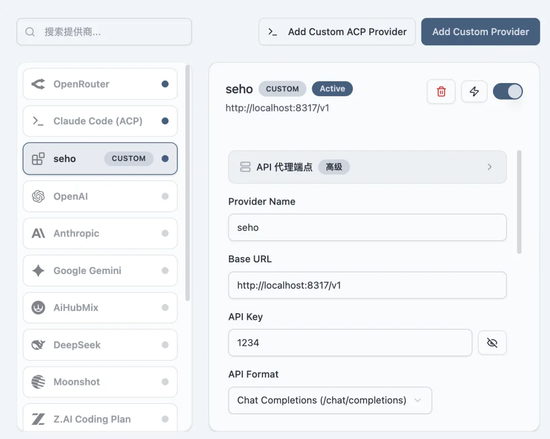 至此,你就可以使用这个 API 去对接你的各种工具了,在 Alma 中可以这样添加一个自定义的 Provider: