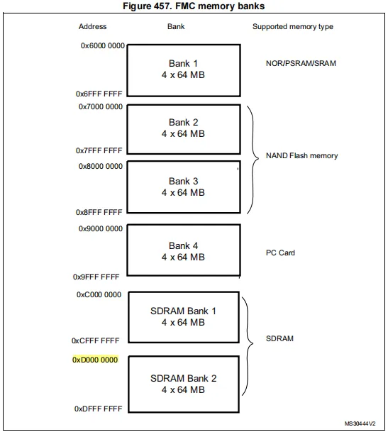这里使用了FMC控制器的SDRAM Bank2,所以SDRAM的起始地址为0xD0000000,具体见下图。所以我们在sdram_func.h文件中定义SDRAM起始地址的宏定义#define SDRAM_BANK_ADDR ((uint32_t)0xD0000000),供后面LCD定义显示缓存时使用。