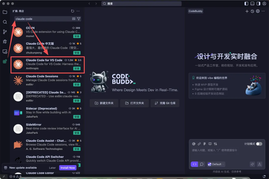 在侧边栏「拓展」这里搜:Claude code,点击安装即可。