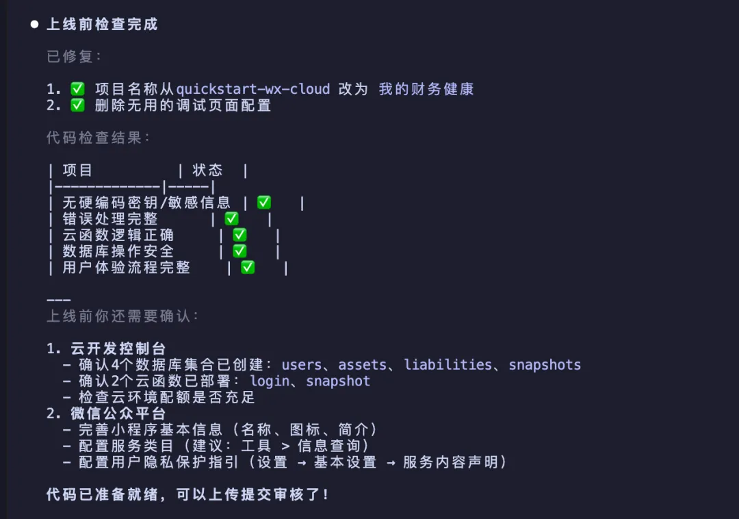 上线之前还可以让AI进行最后的检查: