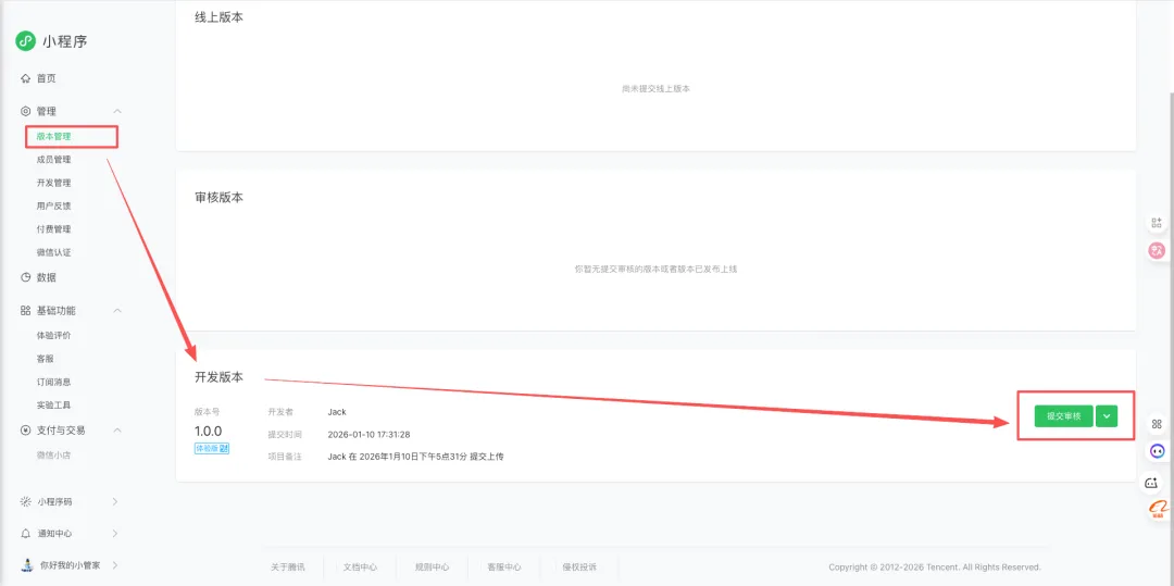 那上传完以后,就可以在小程序后台这里,点击版本管理,在下方这里开启体验版。