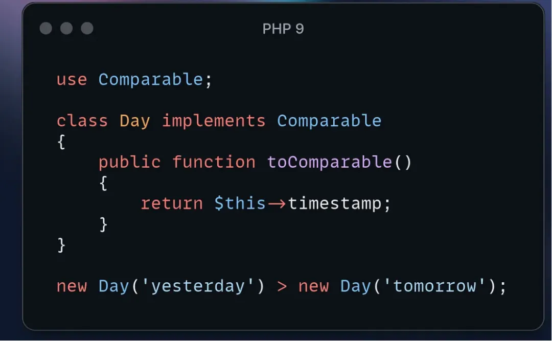 我一直觉得,与 JavaScript 不同,PHP 没有提供比较对象的方法。而 Comparible 接口正好可以实现这一点,这样就无需再进行类型转换、使用奇怪的函数或编写冗长的代码来使某些东西“可比较”。这将修复所有非标量对象,这些对象具有自己的序列化表示形式,并且不会破坏使用运算符进行的比较。