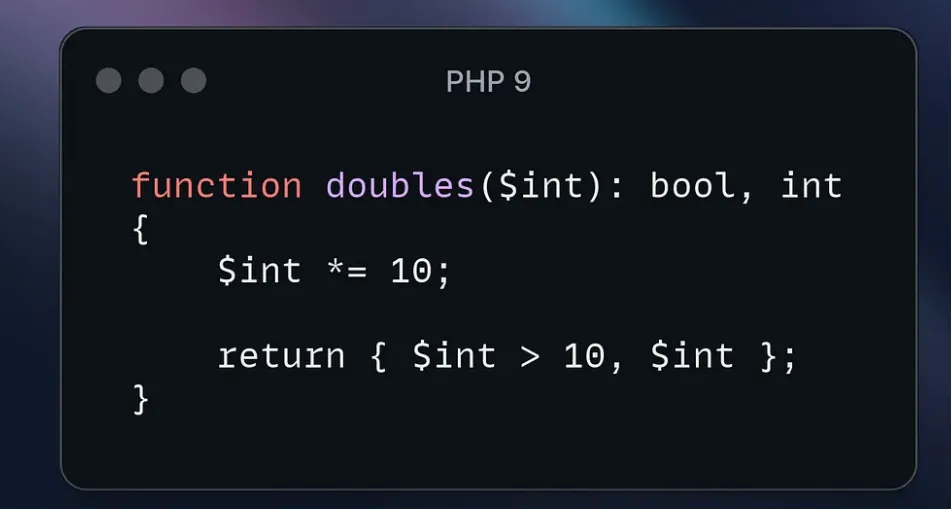 有时在 PHP 中,您被迫返回包含两个成员的数组。虽然这有时是可以接受的,但存在风险,因为您仍需手动检查每个成员的类型。PHP 9 可以通过启用返回元组来解决此问题。例如,您可以将操作的结果与细节(如跟踪、日志甚至基准测试)分别返回。请注意,这并非要取代异常,而是一种避免返回包含两个元素的数组,甚至避免仅仅为了返回具有严格类型控制的内容而创建另一个类的方法。