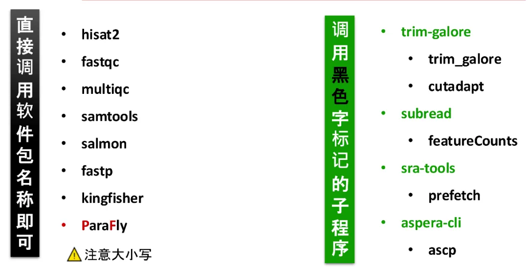 conda install fastqc ##安装一个软件fastqc --help##调用帮助文档来确认是否能用conda install -y fastp fastqc ##安装多个软件conda install fastqc=0.11.7 ##安装指定版本的一个软件conda search fastqc ##查找是否conda里可以装这个软件及其版本conda install -y fastqc ##跳过安装时的确认步骤## 相同平台conda list --explicit > env.txt ##导出conda create --name <env> --file <this file> ##导入## 不同平台conda env export envname > env.yml ##导出conda env create --name <envname> --file env.yml ##导入conda install -y python=3.9 trim-galore cutadapt hisat2 subread multiqc=1.23 samtools salmon fastp fastqc sra-toolsconda install -y kingfisher paraflyconda install hcc::aspera-cli=3.9.6 ##最后一个软件可能因网络问题一直报错,可使用以下网址本地下载上传到服务器并安装:https://conda.anaconda.org/hcc/linux-64/aspera-cli-3.9.6-h5e1937b_0.tar.bz2 ##浏览器打开并下载conda install ./aspera-cli-3.9.6-h5e1937b_0.tar.bz2 ##传输到服务器的当前文件夹并安装使用--help调用以下内容确认已经安装成功