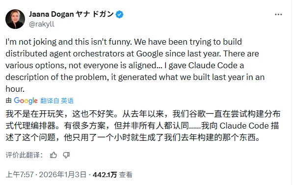 在AI编程工具竞争白热化的当下,一则来自Google内部的“破防”评价引发行业震动。Google Gemini API首席工程师Jaana Dogan近日在社交平台X上公开盛赞Anthropic推出的Claude Code,称其仅用1小时便生成了一个困扰Google团队长达一年的复杂系统框架——分布式代理编排系统,而所用提示词仅有短短三段话。