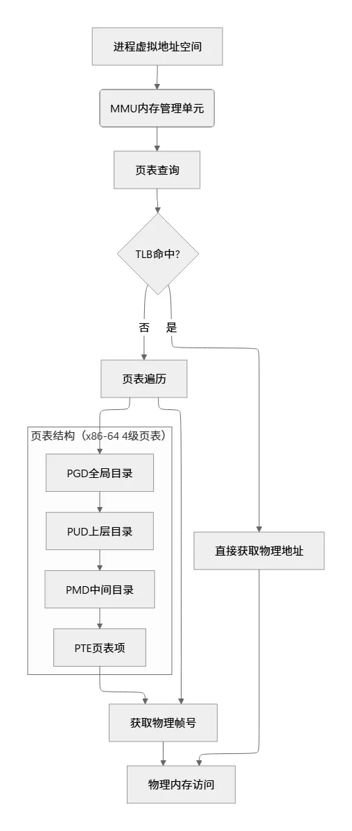 // mm/memory.c 缺页处理核心(极度简化)static vm_fault_t handle_mm_fault(struct vm_area_struct *vma, unsigned long address, unsigned int flags){ // 1. 查找各级页表项 pgd_t *pgd = pgd_offset(vma->vm_mm, address); p4d_t *p4d = p4d_alloc(vma->vm_mm, pgd, address); pud_t *pud = pud_alloc(vma->vm_mm, p4d, address); pmd_t *pmd = pmd_alloc(vma->vm_mm, pud, address); if (!pmd) return VM_FAULT_OOM; // 2. 处理页表中间目录 if (pmd_none(*pmd)) { // 中间目录为空, 需要分配新页表 pte_t *new_pte = pte_alloc_one(vma->vm_mm); pmd_populate(vma->vm_mm, pmd, new_pte); } // 3. 处理实际页表项 pte_t *pte = pte_offset_map(pmd, address); if (pte_none(*pte)) { // 页不存在, 需要分配页面 return do_anonymous_page(vma, address, pte, flags); } else if (pte_present(*pte)) { // 页存在但可能涉及写时复制 return do_wp_page(vma, address, pte, flags); } // 4. 文件映射的特殊处理 if (vma->vm_ops && vma->vm_ops->fault) { return vma->vm_ops->fault(vma, address, flags); } return VM_FAULT_SIGBUS; // 不应该到达这里}