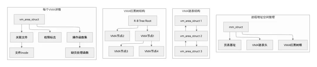 关键点: Linux同时用链表(便于遍历)和红黑树(快速查找特定地址)管理VMA. 查找地址属于哪个VMA时, 红黑树的O(log n)效率远高于链表的O(n)