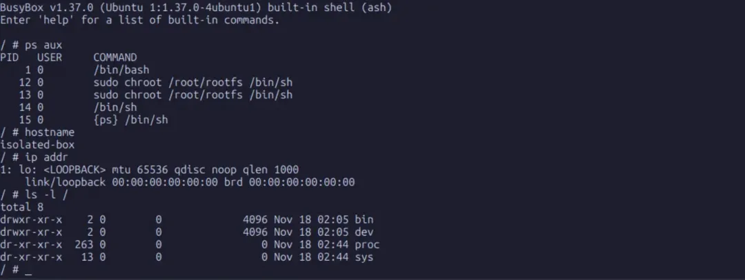至此,我们已经构建了一个最小化的容器,它拥有自己的根文件系统、独立的网络命名空间、环回接口和主机名。