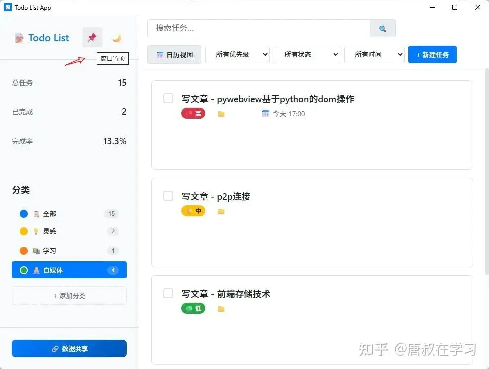 以我最近开发 todo-list 应用为例,有个场景:实现应用窗口在桌面置顶功能。