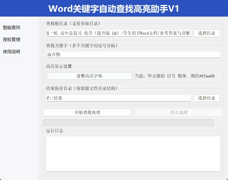 支持指定根目录,自动遍历所有子目录下的.doc/.docx文件,无需手动选择单个文件,覆盖无死角。2. 多关键字批量处理