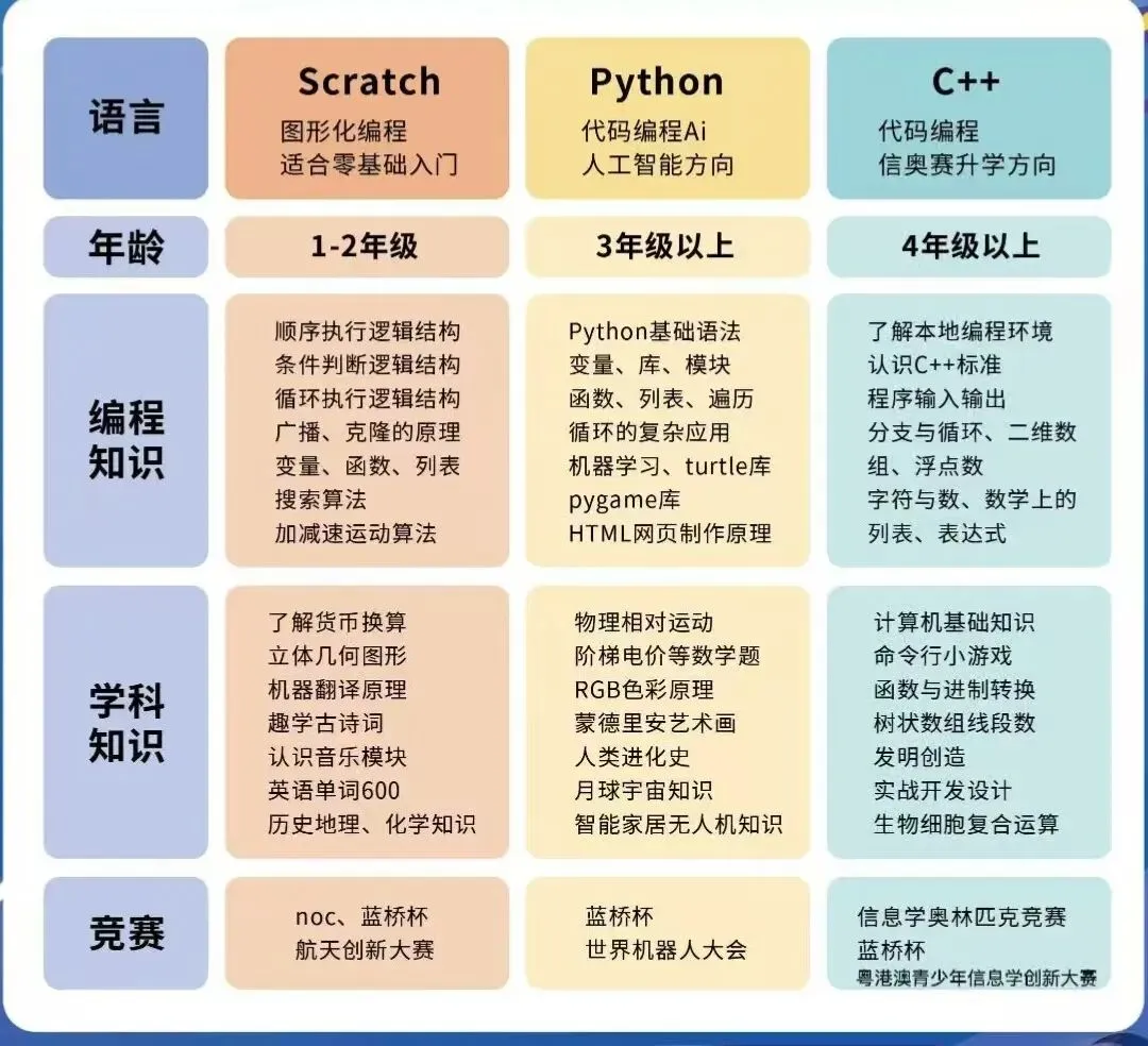 - Scratch:1080元/一期(20节课),图形化编程入门,培养孩子的逻辑思维与创意表达,零基础也能轻松上手;