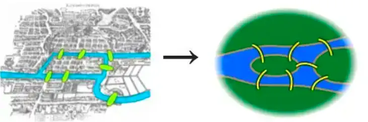 十八世纪初,欧洲名城普鲁士的哥尼斯堡边上有一条河,河中有两座小岛,有七座桥把两个岛和两岸连接。一个人怎么样才能不重复地一次走完这七座桥,最后回到起点?