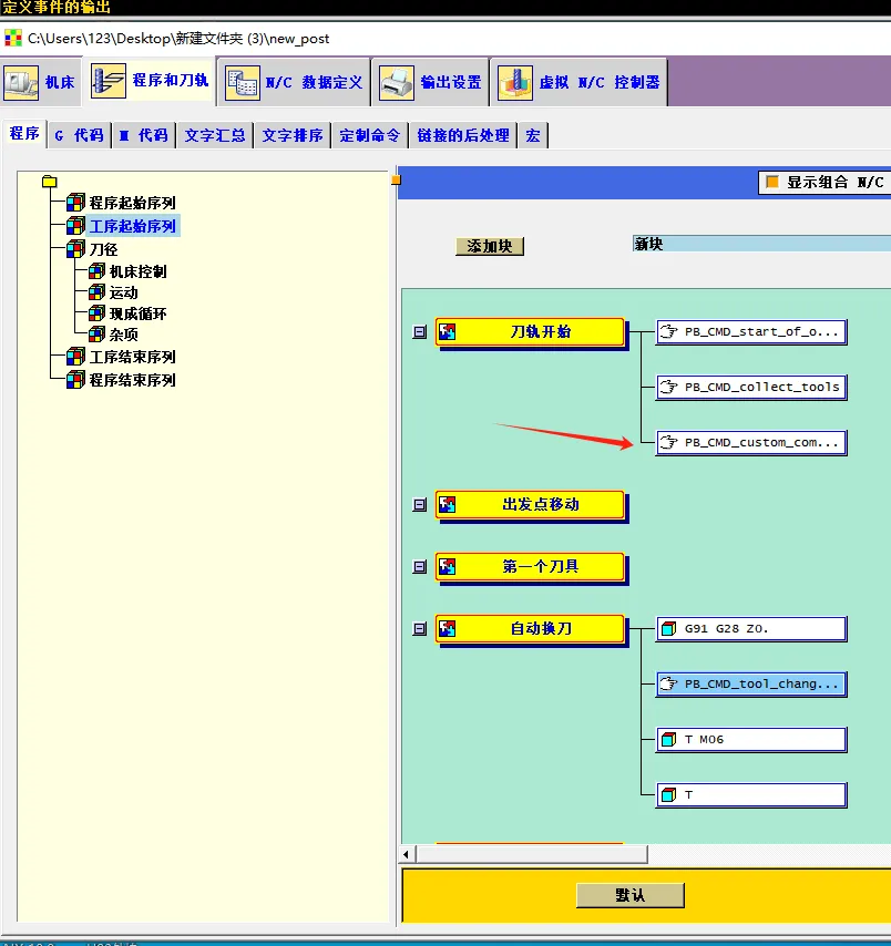 1、打开后处理构造器,在工序起始序列-刀轨开始后面添加定制命令。
