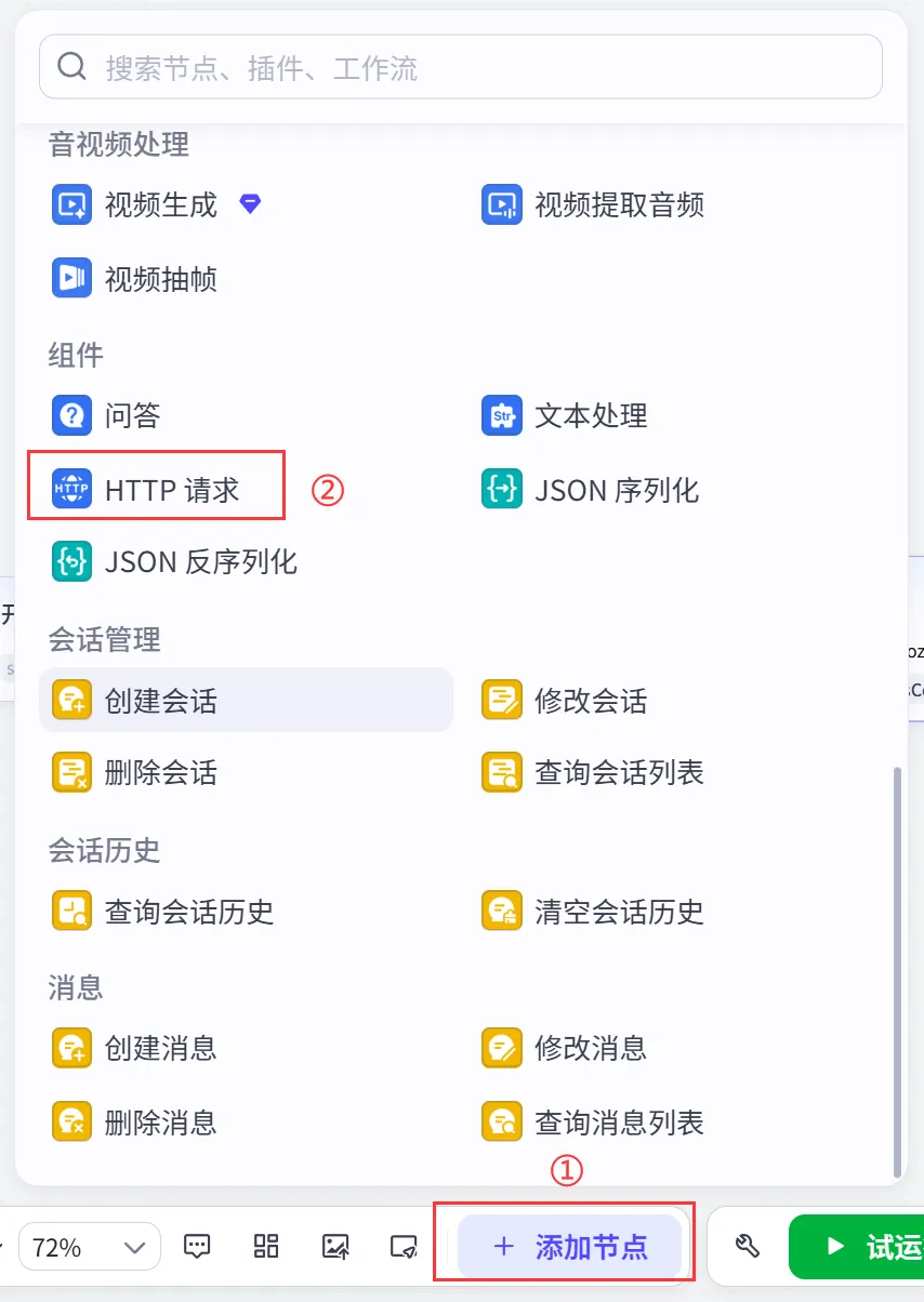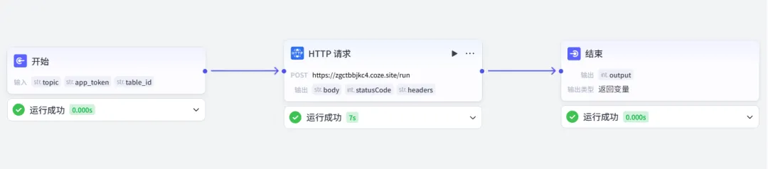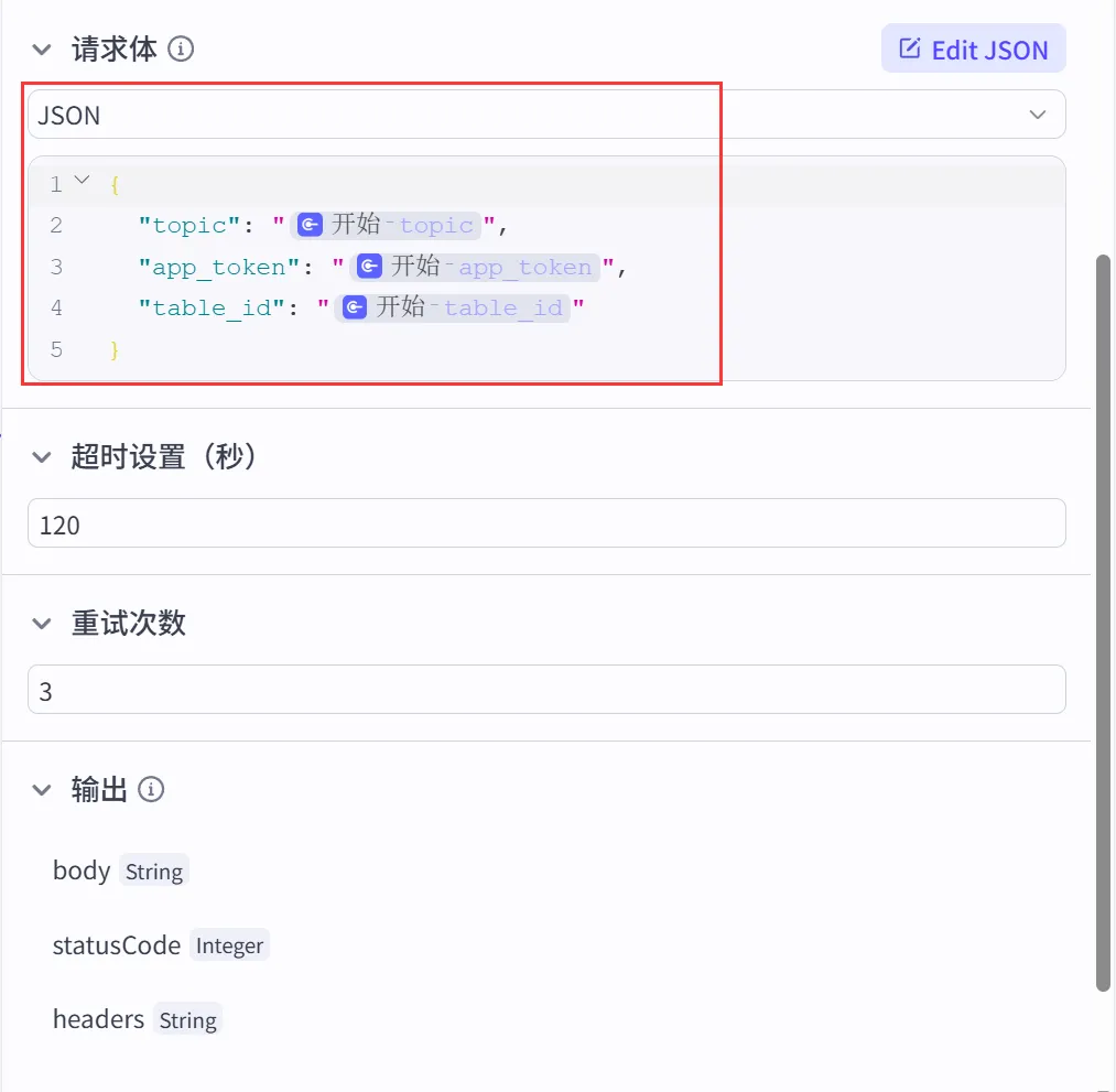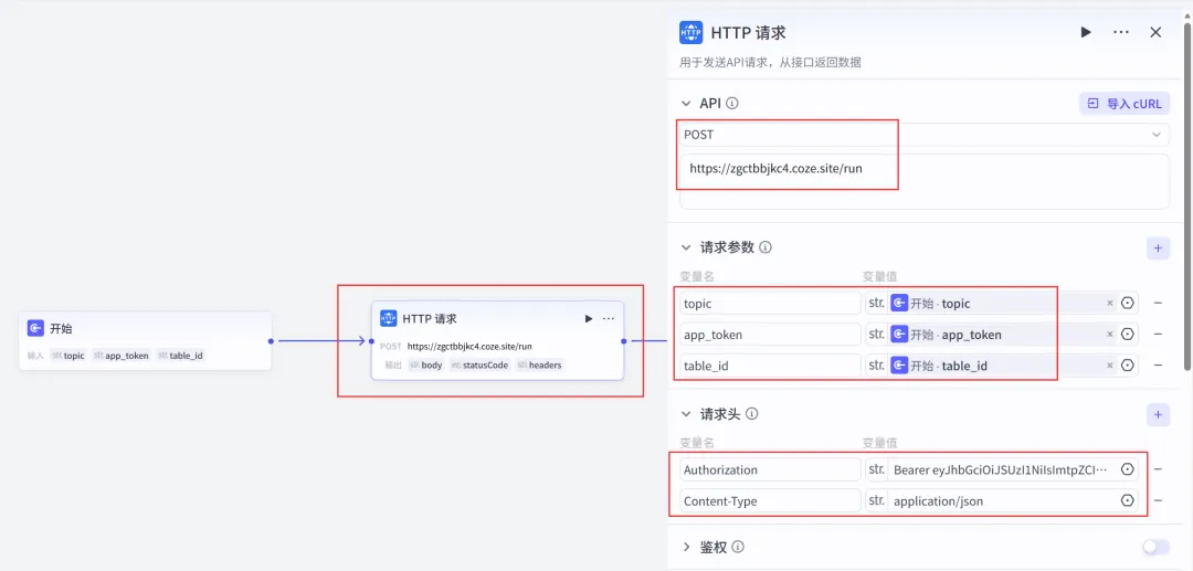 topic表示用户输入的话题,如“焦虑”这种比较贴近心理的词;app_token和table_id是从飞书多维表格链接中进行获取的字段,后面的测试时会告诉大家从哪里获取。(3)在开始节点后添加一个HTTP请求节点->设置参数;(全文最关键的步骤)- POST的接口地址填写扣子编程部署工作流后的POST请求;