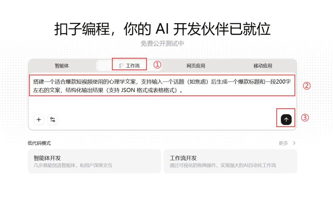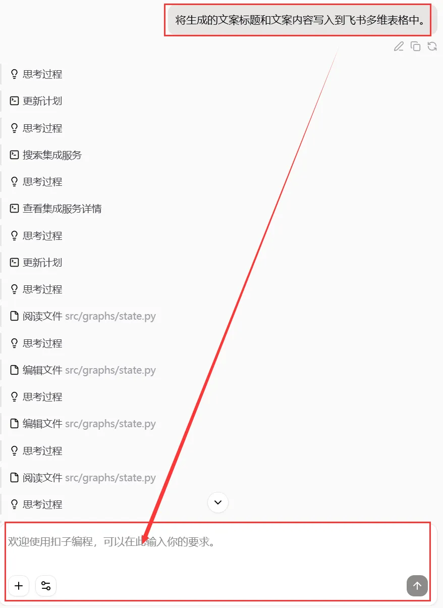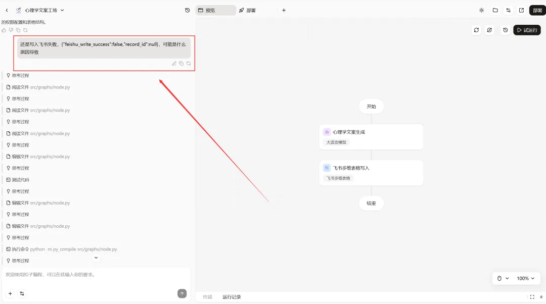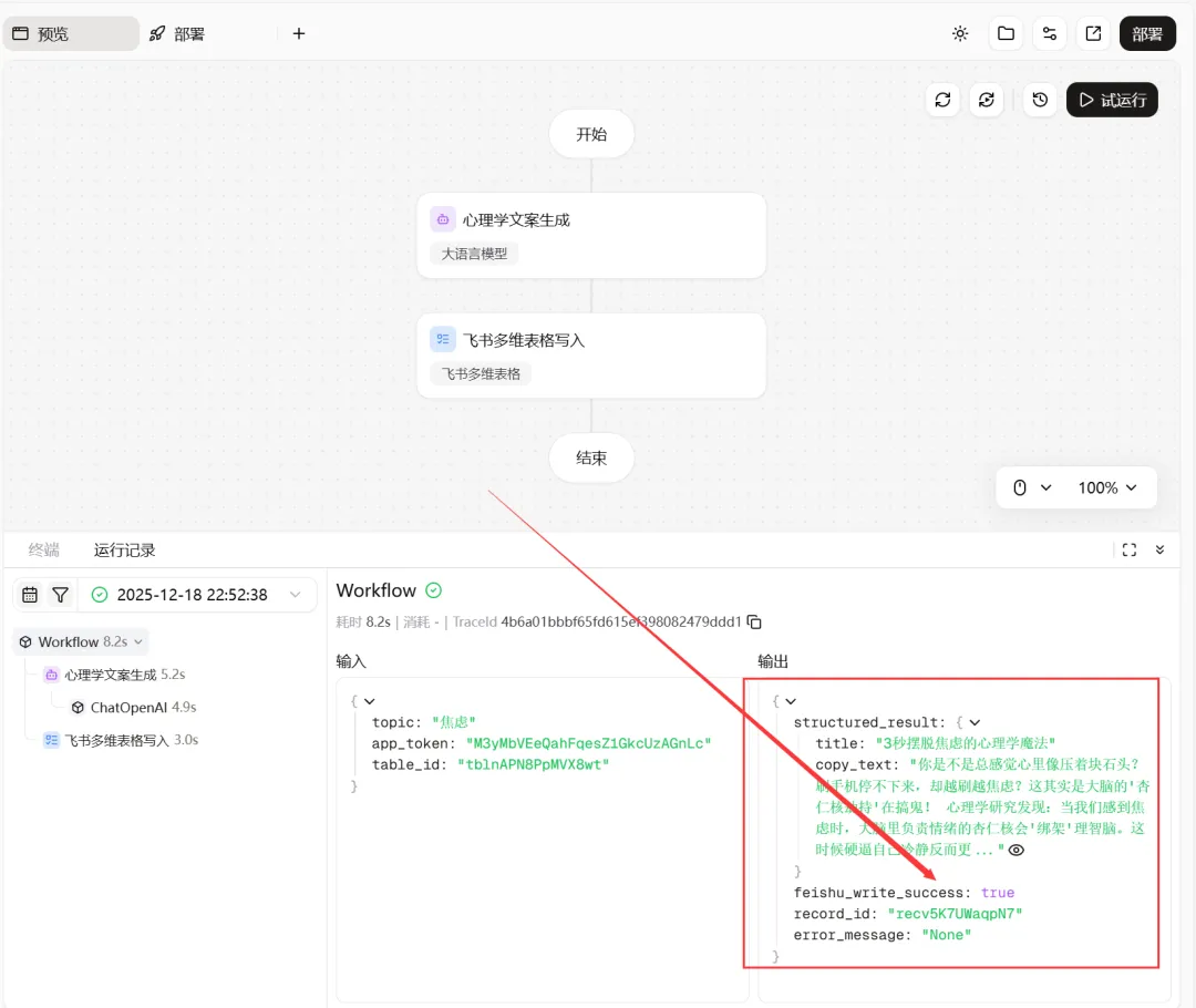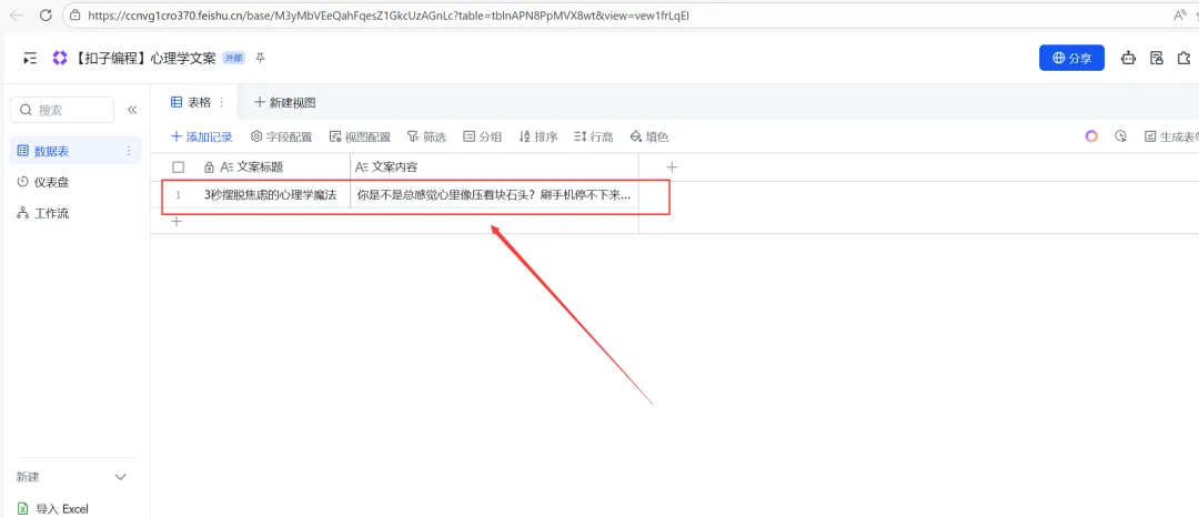 用扣子编程生成了一个心理学文案工作流,支持写入飞书,稍显复杂,建议生成简单点的工作流。(1)登录飞书,创建一个多维表格,添加两个文本字段:文案标题和文案内容;扣子编程:https://code.coze.cn/(1)登录扣子编程,点击工作流,输入想做的内容,可以是大白话,发送给扣子编程;搭建一个适合爆款短视频使用的心理学文案,支持输入一个话题(如焦虑)后生成一个爆款标题和一段200字左右的文案,结构化输出结果(支持 JSON 格式或表格格式)。