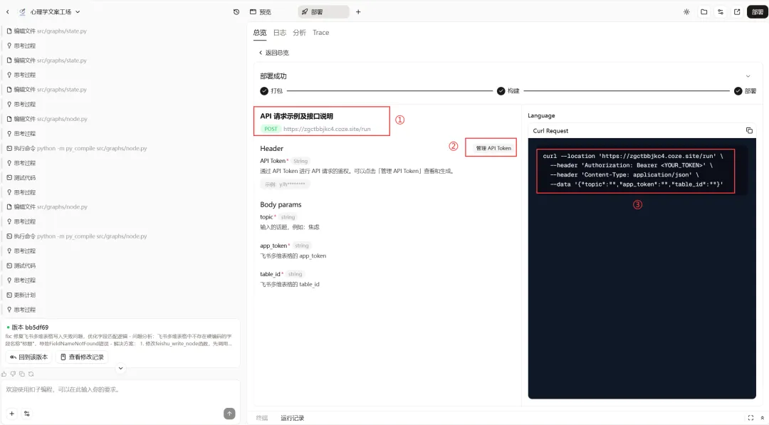 (2)这里我又给扣子编程发了句话,想要工作流结果能直接写入飞书,在自动编码过程中会请求飞书授权,记得点同意授权;(4)测试了一下,发现写入飞书失败,将报错信息复制发给扣子编程,让AI自动修复;(7)将工作流一键部署发布后,有以下①②③三个重要部分;②中的API Token保存下(点击管理API Token可以直接复制);③中一大堆内容其实是在描述请求的消息格式,后面会用到这里的内容;