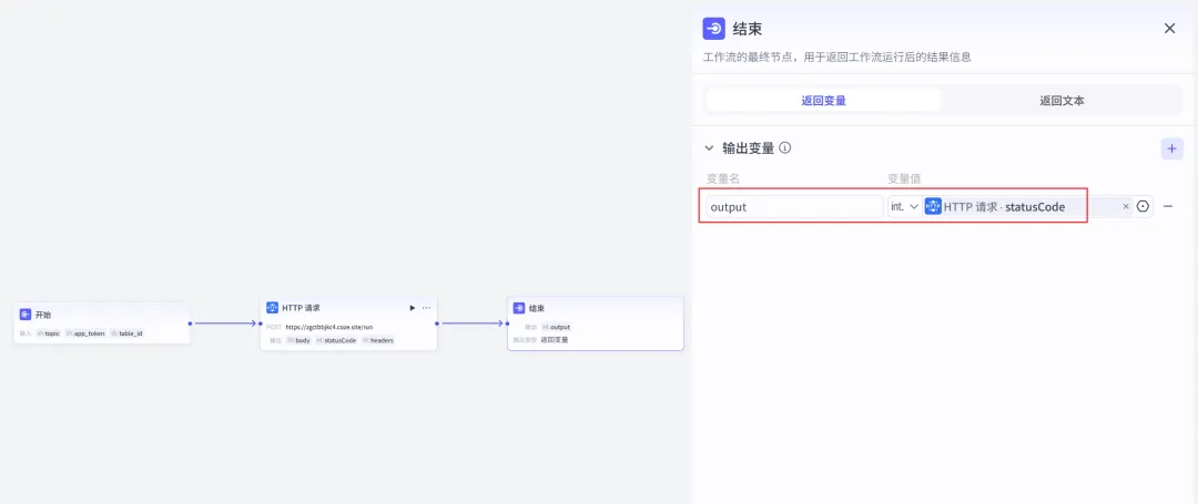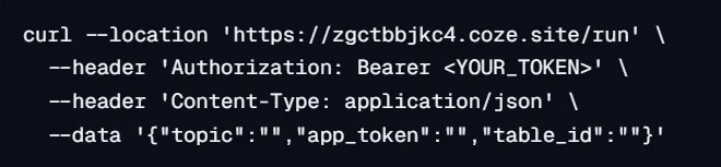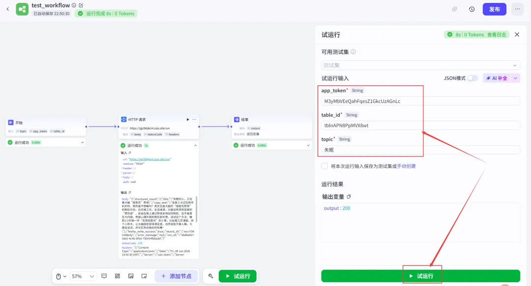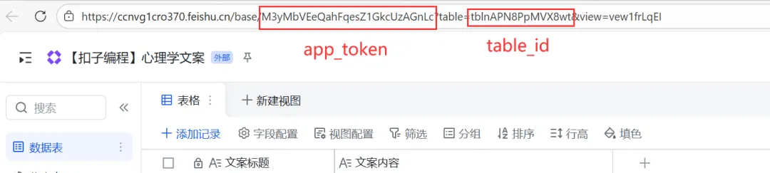 这里说下app_token和table_id的来源,其实就是从之前创建的飞书多维表格链接中获取。到这里我们就成功把扣子编程生成的工作流当作一个插件使用了。