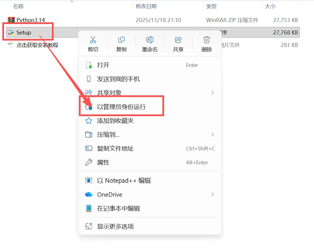 2.文件解压完成后,右键选择“Setup”,然后点击“以管理员身份运行”;