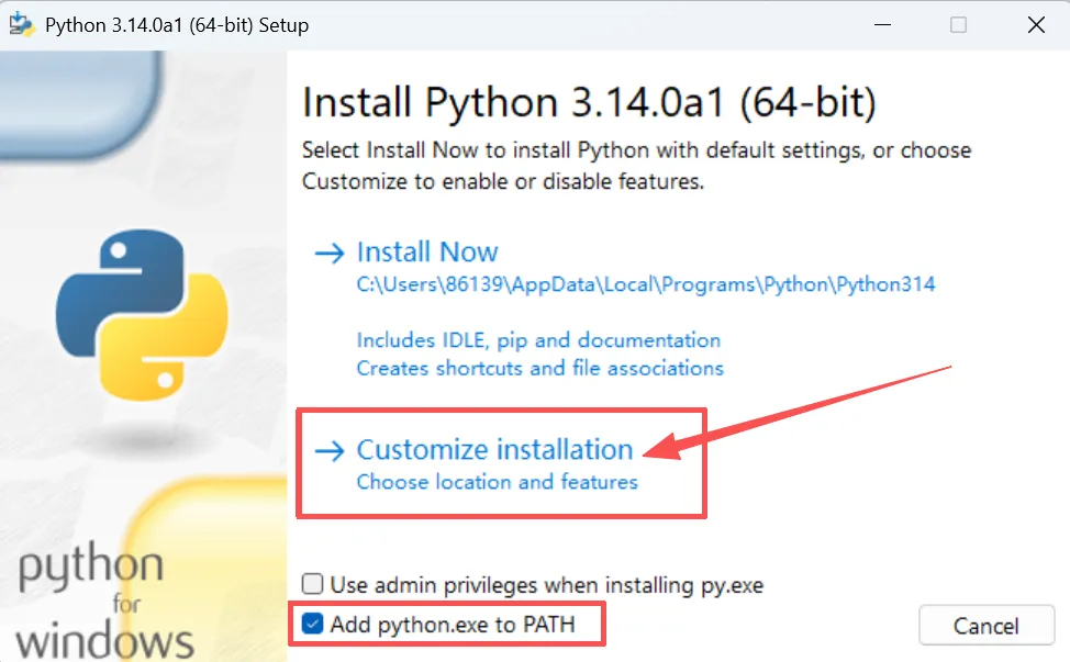 3.勾选“Add Python...PATH“点击“Customize installation“;