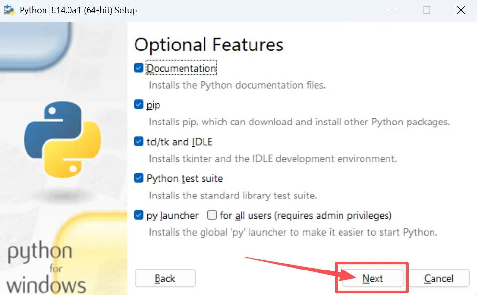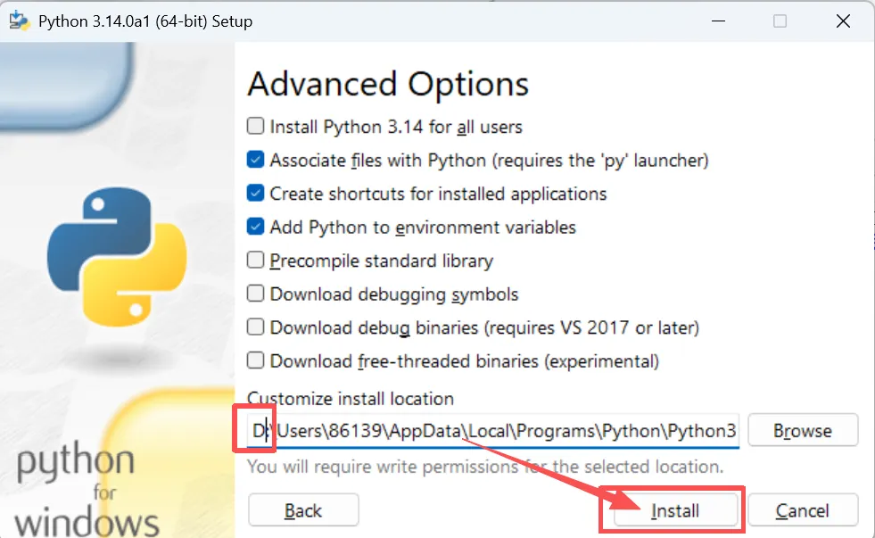 5.①勾选“Install Python 3.14 for all users“②修改路径地址中的第一个字符C可更改安装位置(如:把C改为D软件将安装到D盘)③点击“Install“;