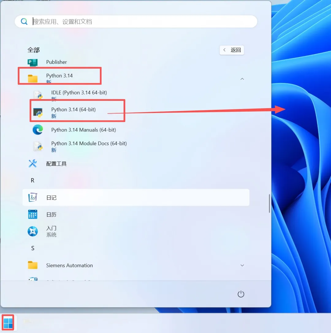 8.创建桌面快捷方式:①点击桌面任务栏中的“开始图标“>点击“所有应用“>双击展开“python3.14“文件夹②将“IDLE (Python 3.14 64-bit)“图标拖到电脑桌面;
