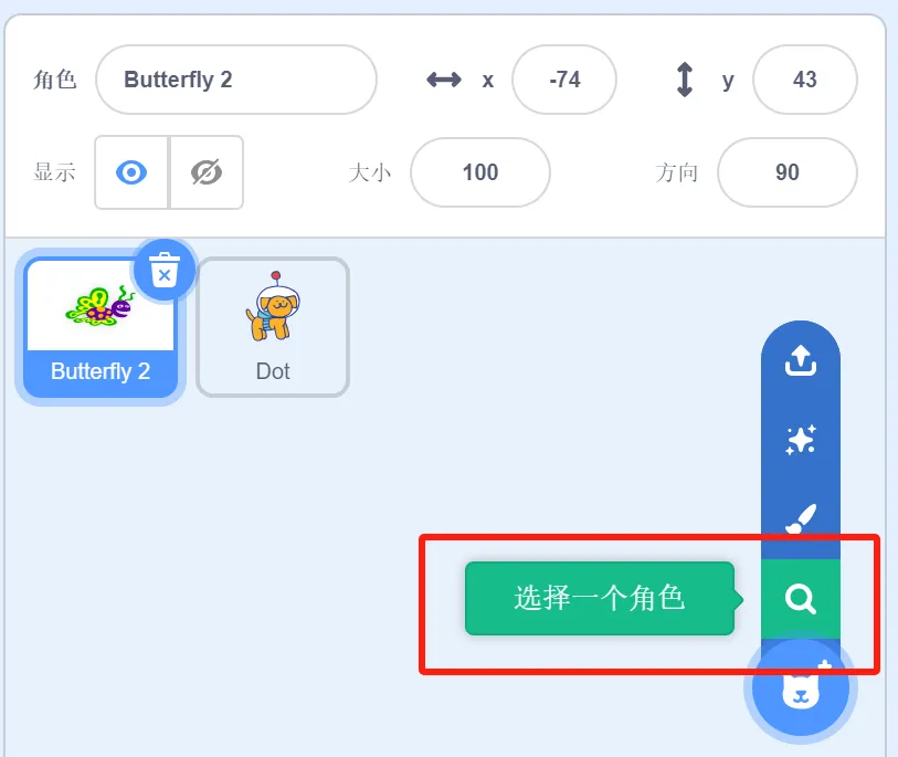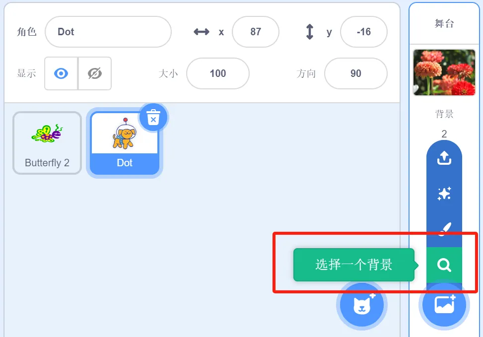(2)删除默认角色小猫,选择角色蝴蝶Butterfly 2、小狗Dot;