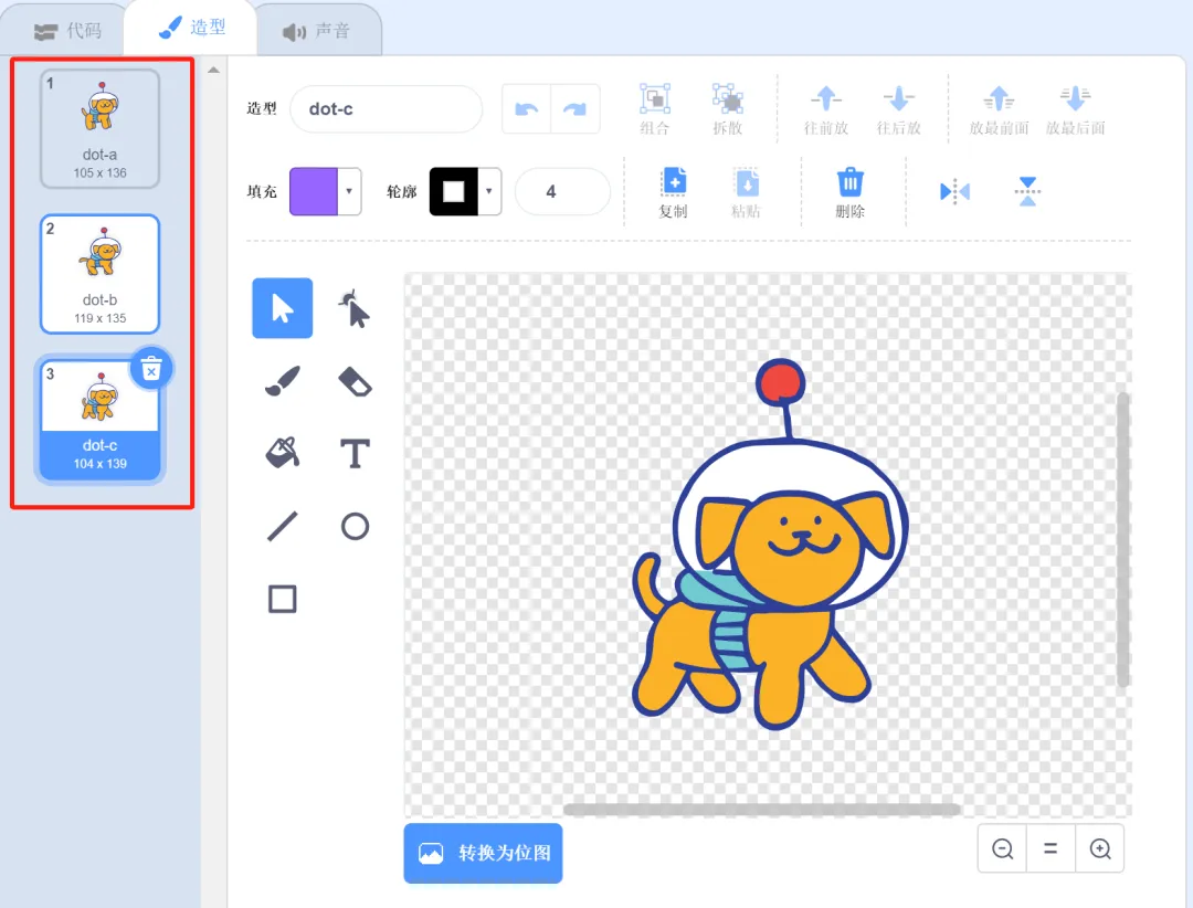 角色小狗只保留三个造型:dot-a、dot-b、dot-c,删除dot-d。