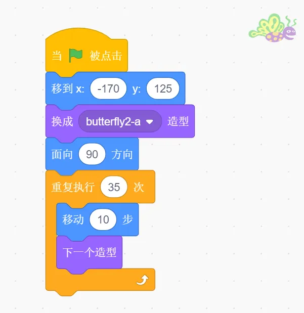(2)点击绿旗后,蝴蝶向右边飞,边飞边扇动翅膀,停留在舞台最右边;