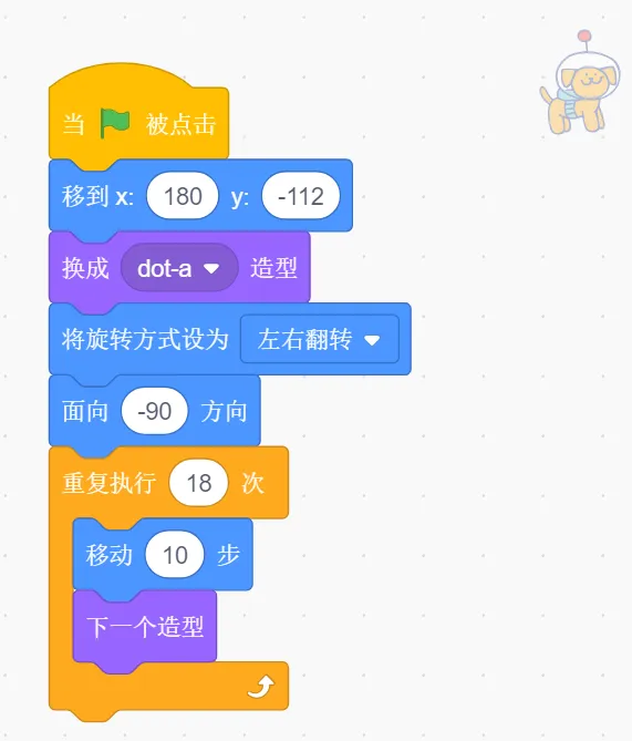 (3)点击绿旗后,小狗摇动尾巴从右向左走,边走边迈步,停留舞台中间位置。