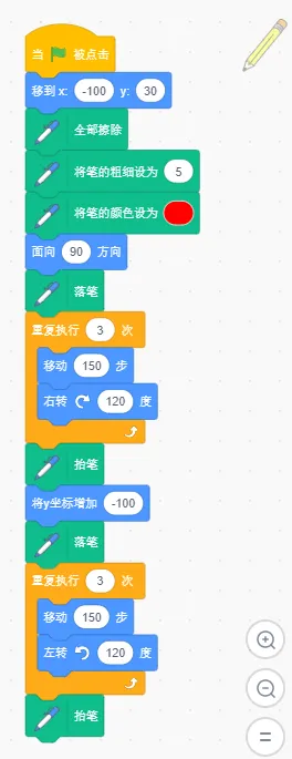 (3)画笔抬笔,向下移动 100 步后,再落笔,绘制第 2 个三角形,边长为 150,如下图所示。