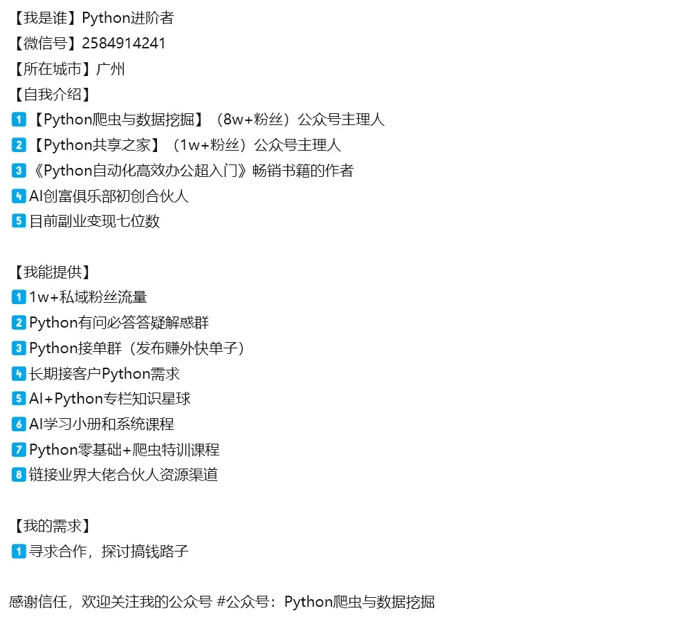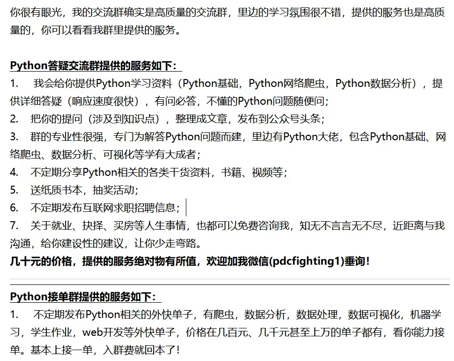 大家在学习过程中如果有遇到问题,欢迎随时联系我解决(我的微信:2584914241),应粉丝要求,我创建了一些高质量的Python付费学习交流群和付费接单群,欢迎大家加入我的Python学习交流群和接单群!