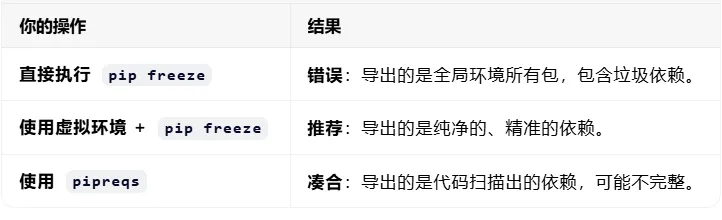 lpip freeze 的逻辑非常简单粗暴:“把当前 Python 环境里安装的所有第三方库,不管有用没用,全部列出来。”