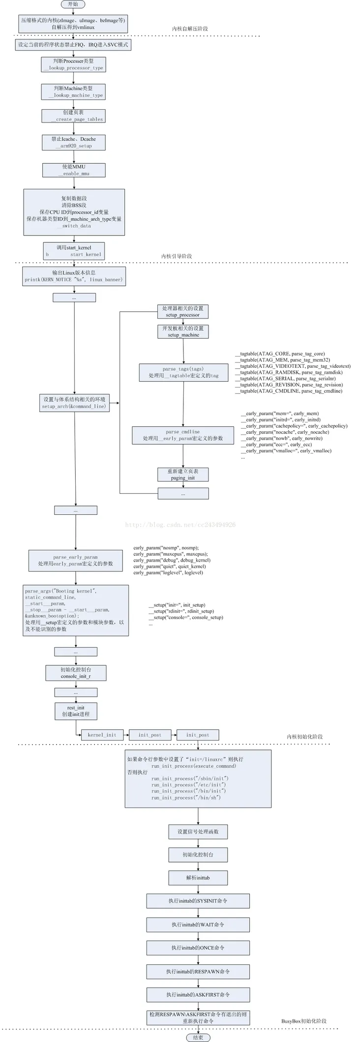 Linux 内核启动流程就分析到这里, Linux 内核最终是需要和根文件系统打交道的,需要挂载根文件系统,并且执行根文件系统中的 init 程序,以此来进入用户态。当内核被引导并进行初始化后,内核启动了自己的第一个用户空间应用程序_init,这是调用的第一个使用标准C库编译的程序,其进程编号时钟为1._init负责出发其他必须的进程,以使系统进入整体可用的状态。