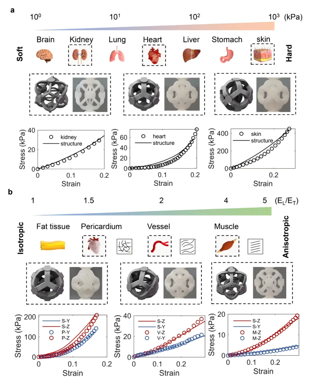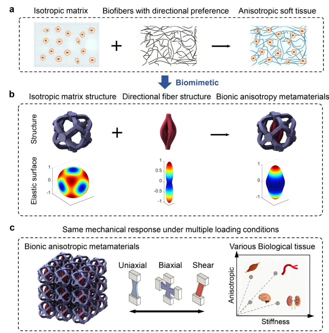 针对这一问题,本文提出了一类仿生软各向异性超材料(Bionic Soft Anisotropic Metamaterials, BSAMs)。该结构通过将准各向同性基体结构与定向增强纤维结构相结合,在应变能层面实现了与软生物组织相一致的力学响应,从而摆脱了对特定加载模式的依赖。结合有限元模拟、实验测试以及神经网络辅助的反向设计方法,BSAMs 成功复现了从肾脏(kPa 量级)到皮肤(MPa 量级)等多种软组织在不同加载工况下的非线性和各向异性力学行为。
