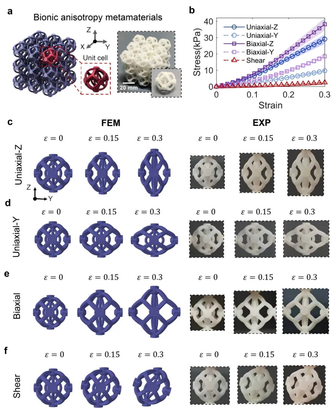 图2 BSAM 单胞在多加载工况下的各向异性非线性力学响应。(a) BSAM 单胞的三维模型及基于选择性激光烧结(SLS)3D 打印制备的实物样品;(b) BSAM 单胞在不同加载条件下的实验应力–应变曲线,阴影区域表示实验误差范围;(c–f) 在周期性边界条件下,单胞有限元仿真结果(左)与实物样品实验变形形态(右)的对比,分别对应:(c) Z 方向单轴拉伸,(d) Y 方向单轴拉伸,(e) YZ 平面内双轴拉伸,(f) YZ 平面内纯剪切加载。