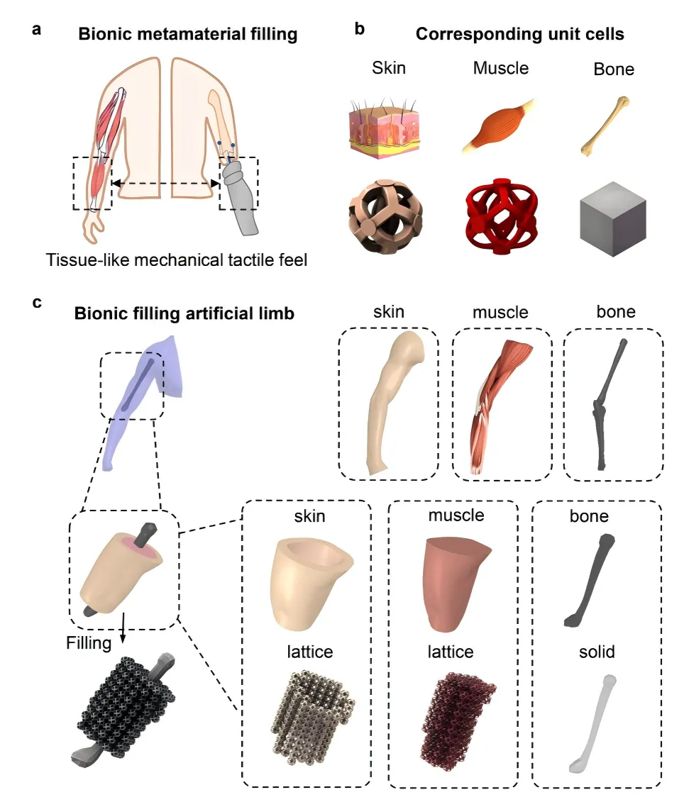 图6 基于区域化填充策略的仿生力学结构设计。(a) 人体上肢力学性能分布的概念示意,用于实现具有类人体触感的假肢或机器人结构;(b) 分别针对皮肤、骨骼肌和骨组织反向设计的 BSAM 单胞结构;(c) 通过区域化填充不同 BSAM 单胞构建的仿生假肢结构,实现几何形态与力学性能分布的同时仿生。