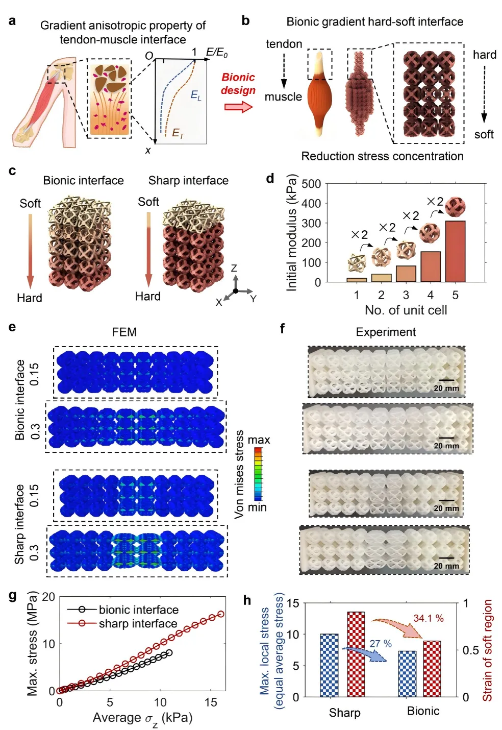 图7 基于 BSAMs 的仿生软–硬梯度界面设计及其力学性能。(a) 天然骨–腱界面中各向异性力学性能沿界面方向的分布示意;(b) 受肌腱–肌肉结构启发的仿生梯度软–硬界面设计思想;(c) 梯度界面结构与突变式软–硬界面对比试样的几何模型;(d) 梯度界面中各层 BSAM 单胞的初始弹性模量分布;(e, f) 在工程应变为 0.15 和 0.3 时,有限元模拟与实验观测到的结构变形对比;(g) 两种界面结构在相同平均应力条件下的最大局部等效应力对比;(h) 在最大拉伸变形下,两种界面结构的最大局部应力及软相平均有效应变的对比结果。