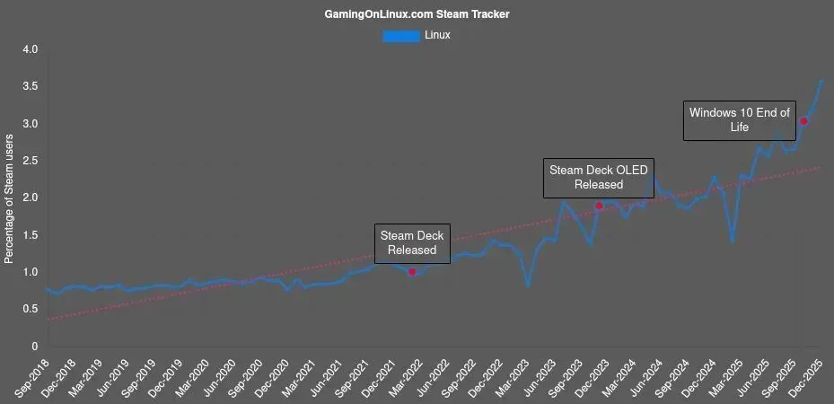 或许有人觉得3.58%的比例微不足道,但要知道Steam全球活跃用户数早已突破数亿,按这个基数换算,Linux玩家的绝对数量早已突破千万级别,增长势头相当迅猛。