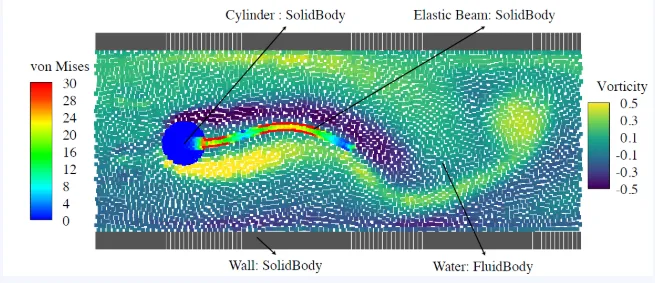 在SPHinxSys中,所有介质都被建模为SPH(光滑粒子流体动力学)Body。每一个Body由一组SPH粒子组成。如下流固耦合问题: