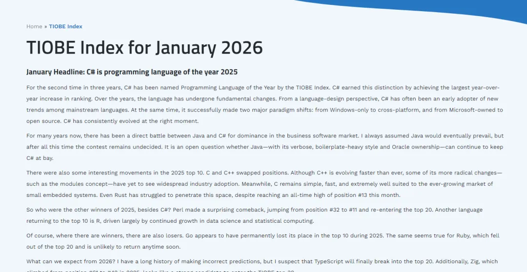 TIOBE CEO Paul Jansen对2026年做出了预测:他预计TypeScript可能会首次进入前20名,而新兴的Zig(2025年从第61位上升到第42位)则有望进入前30名。