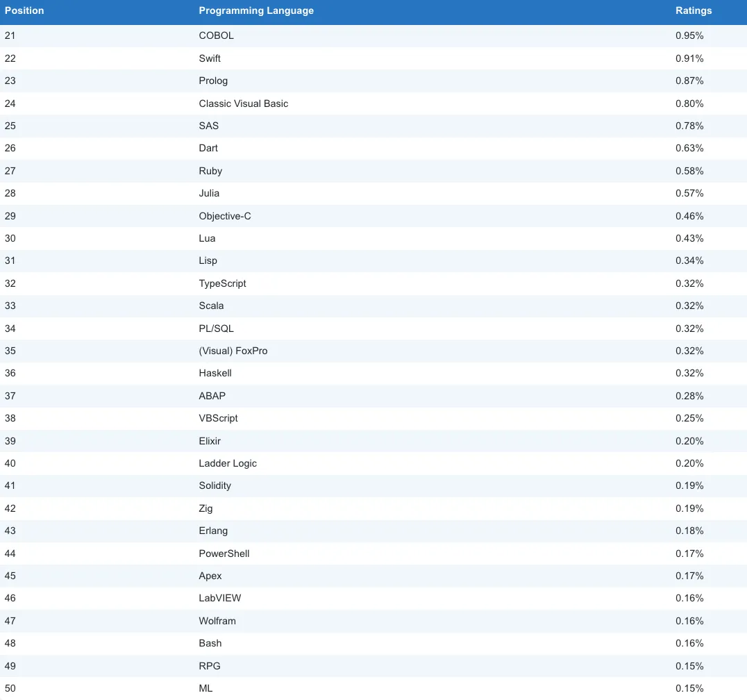 值得注意的是,一些曾备受期待的语言也显现出颓势。Go似乎在2025年永久失去了其在Top10的位置,同样的情况也发生在Ruby身上。