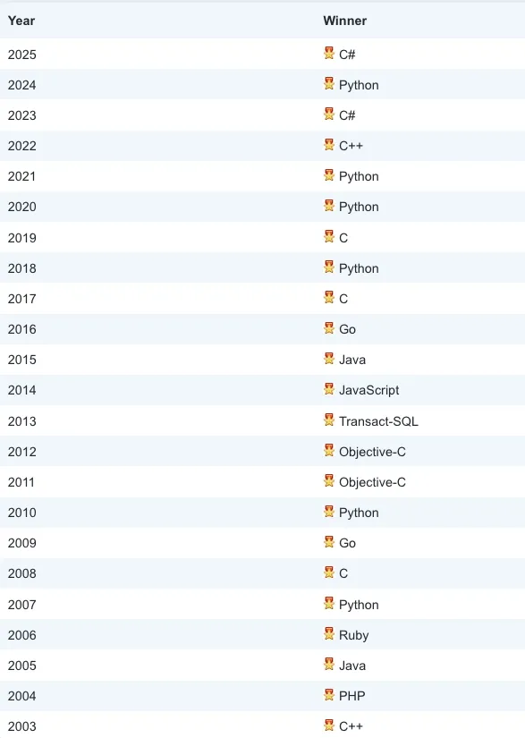 除了C#获得年度编程语言荣誉外,2025年还有其他值得关注的编程语言动态: