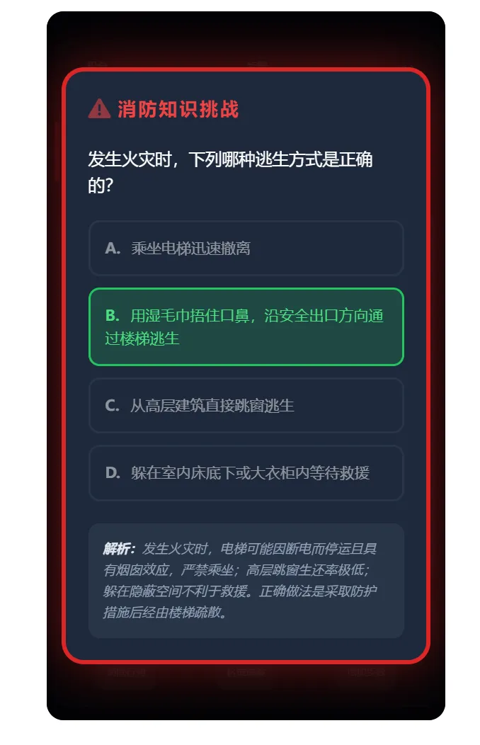• 设置知识问答模块展示消防法规"