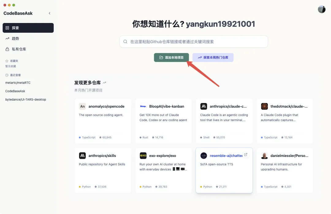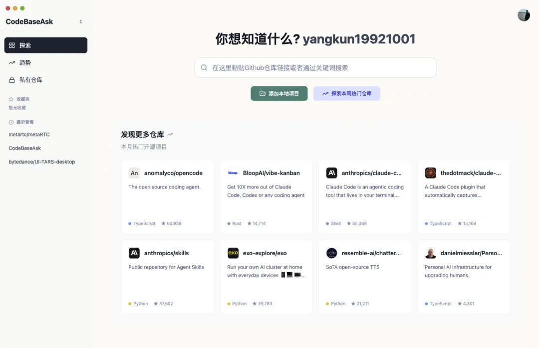 CodeBaseAsk 是一款桌面端 AI 智能代码助手,帮助开发者快速理解和分析任意代码仓库。无论是开源项目还是本地项目,只需简单操作即可生成详细的项目文档 Wiki,并通过自然语言与 AI 进行深度问答交互。