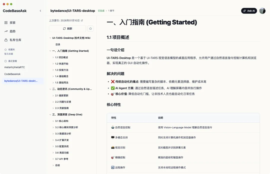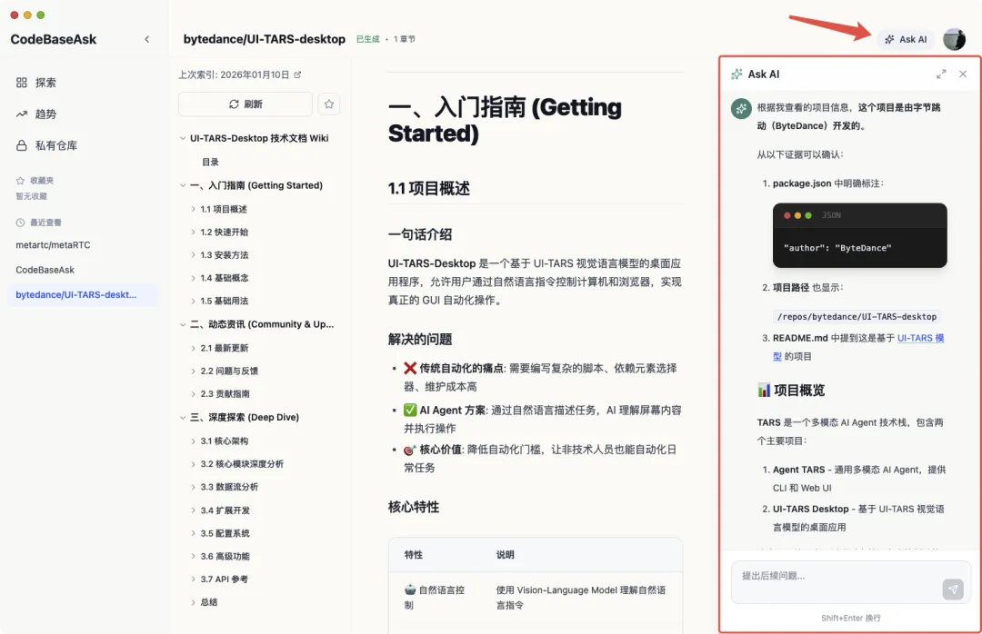 - 开始问答:点击右上角"Ask AI"按钮,输入问题
