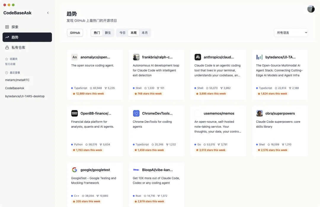 - 多维度筛选:按语言(Python、Go、JavaScript 等)筛选