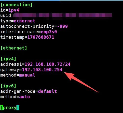 方法4:通过 ping 测试(间接验证网关),就是去ping常见的网关,其实这方法不好猜。方法5:查看网络接口配置文件(静态ip场景),前提是配置了静态 IP,生产环境100%都是静态ip吧。网关信息会写在网络接口配置文件中,比如使用NetworkManager管理的话,文件就在这里:/etc/NetworkManager/system-connections/连接名.nmconnection