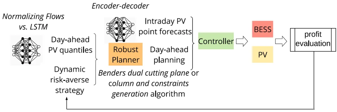 研究构建了 “预测 - 优化 - 控制” 三阶段策略框架,完美适配容量市场的日前申报 + 实时控制流程(图 1)。图 1. 概率预测驱动的鲁棒优化策略总览(图片序号为论文中序号 1)核心逻辑:日前阶段用 NF 生成光伏分位数预测,输入鲁棒优化模型得到申报曲线;实时阶段用编码器 - 解码器生成短期点预测,调整储能充放电策略。该框架首次将概率预测与鲁棒优化深度耦合,突破传统确定性预测的局限性。框架优势在于全流程适配实际市场规则,但需依赖高质量历史数据训练预测模型,对于数据积累较少的新项目,初期效果可能受影响。