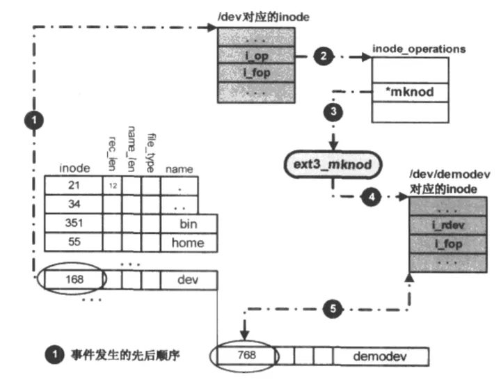 展示了通过ext3 文件系统在/dev目录下生成一个新的设备节点/dev/demodev 的主要流程。